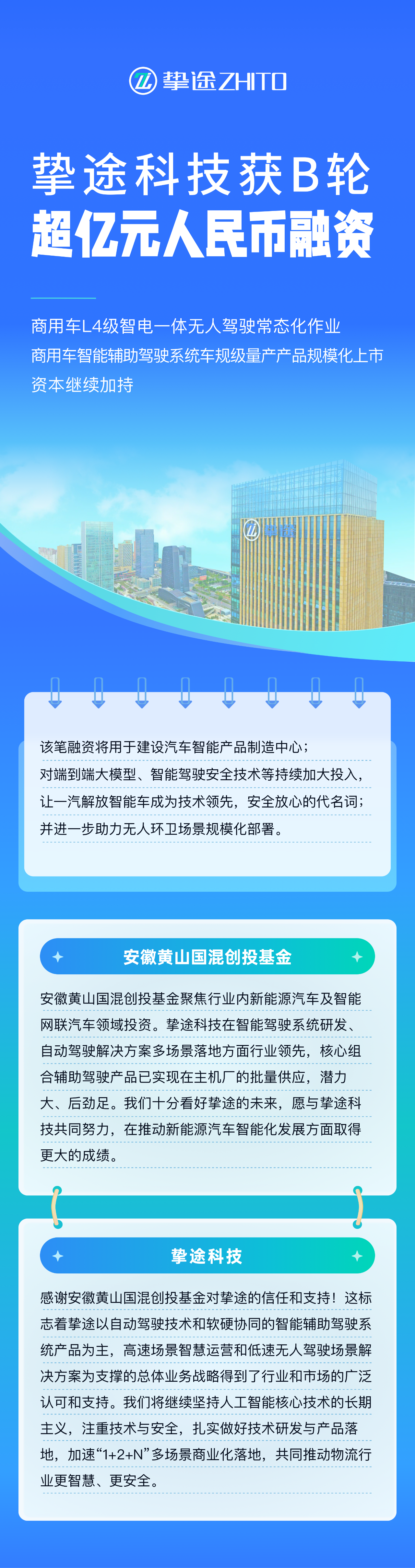 近日,商用车自动驾驶头部企业挚途科技完成超亿元B轮融资首轮交割,投资方为安徽黄山国混创投基金。该笔融资将用于建设汽车智能产品制造中心;对端到端大模型、智能驾驶安全技术等持续加大投入,让一汽解放智能车成为技术领先,安全放心的代名词;并进一步助力无人环卫场景规模化部署。
