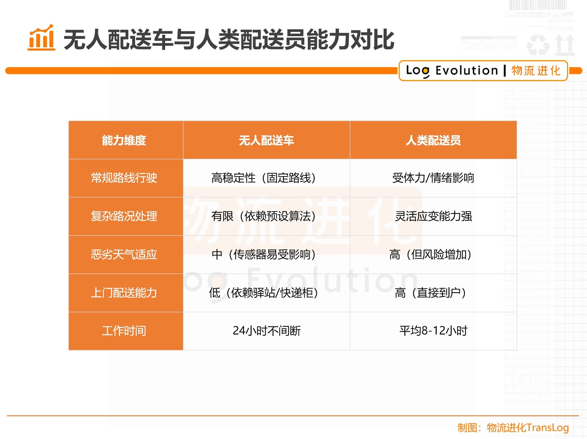 更为根本的是,无人车与快递员、骑手相比,在复杂路况处理、恶劣天气适应、上门配送能力等方面也面临不足(见表1)。