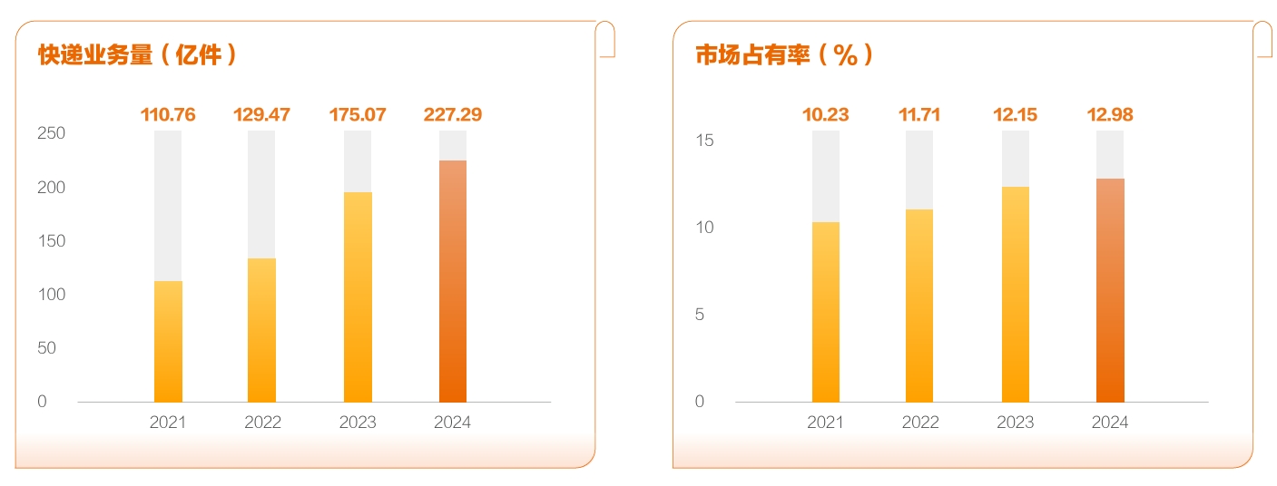 申通快递近年业务量及市占率;来源:申通快递2024年报