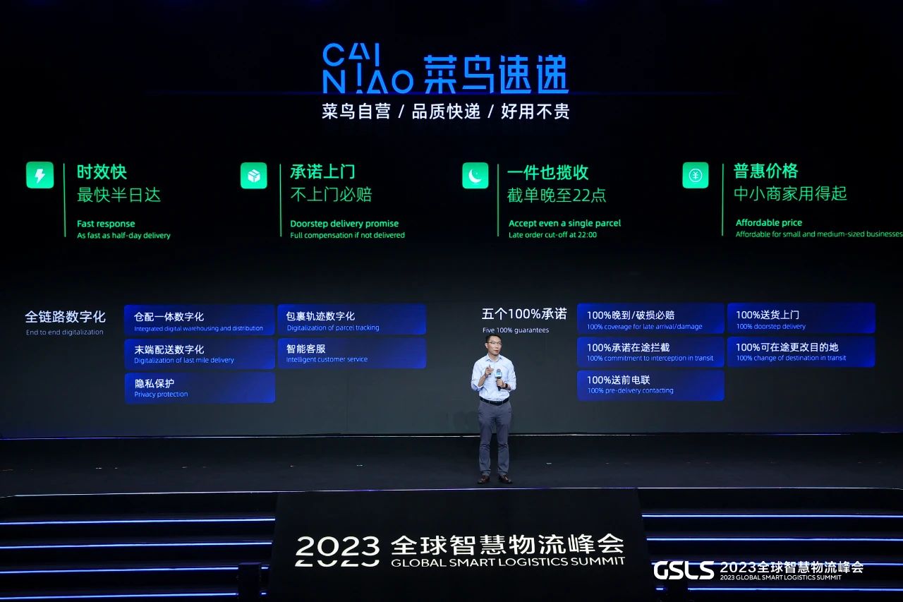 2023年,菜鸟速度拿到快递牌照,并在当年全球智慧物流峰会上进行了品牌发布,主打的半日达、当次日达、送货上门和夜间揽收等品质服务,在全国近三百城提供晚到、破损必赔,不上门必赔,在途拦截和在途更改目的地等五个100%承诺。