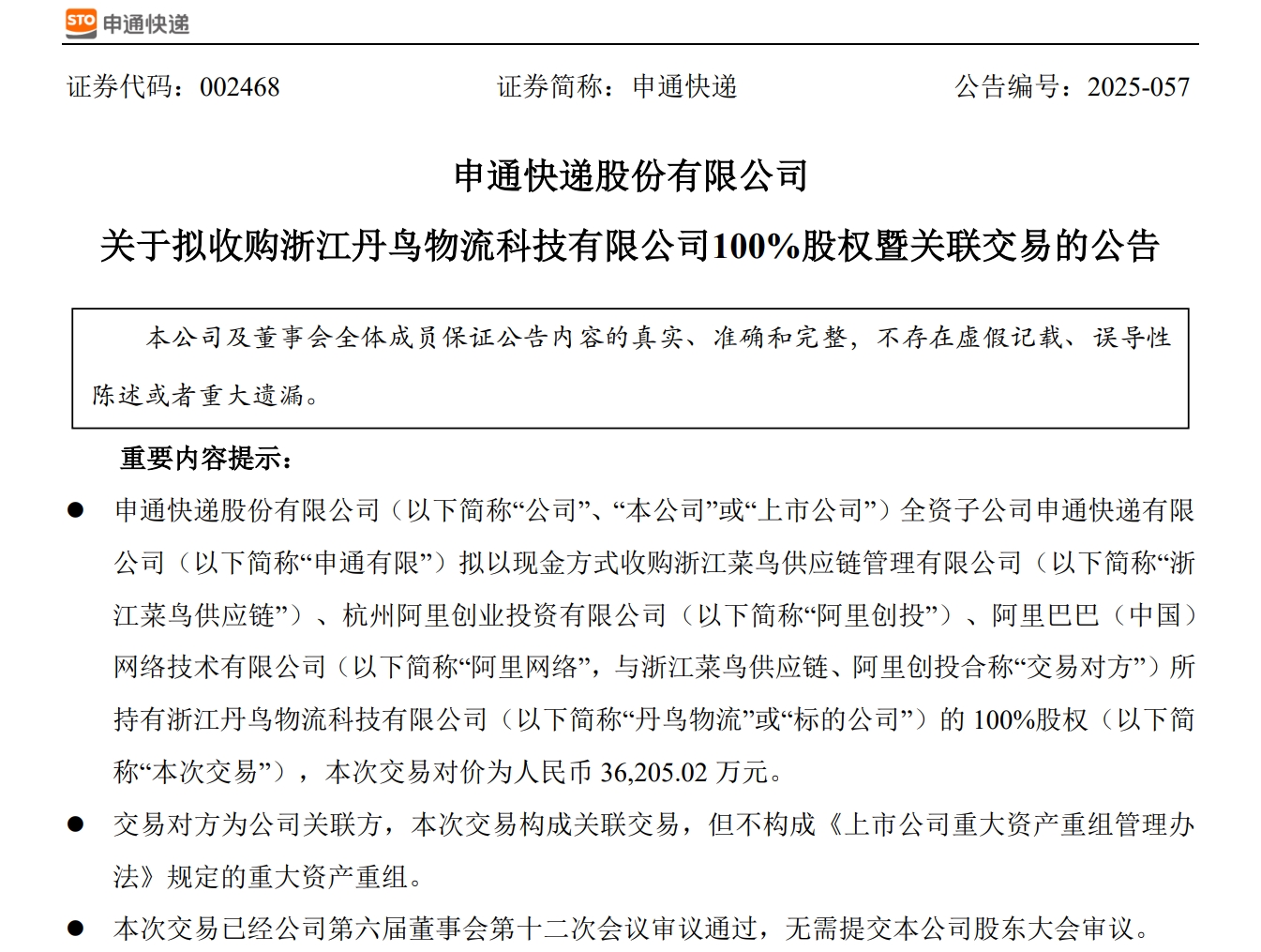 上述公告指出:申通快递股份有限公司的全资子公司申通快递有限公司计划以现金形式收购浙江菜鸟供应链管理有限公司、杭州阿里创业投资有限公司、阿里巴巴(中国)网络技术有限公司所持有的浙江丹鸟物流科技有限公司100%股权,此次交易的对价为人民币36,205.02万元。