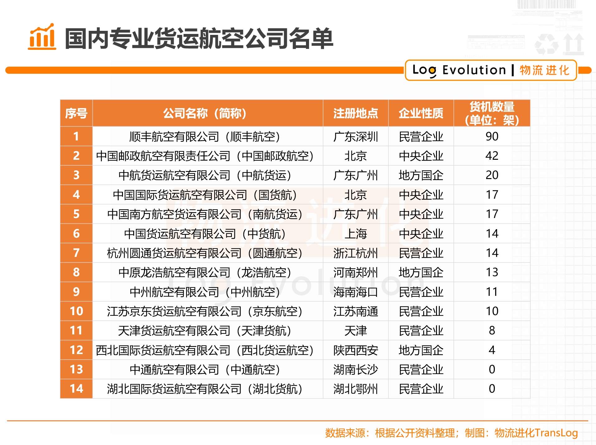 截至目前,国内在运营的专业货运航空公司共有14家,注册地主要分布在广东3家,北京2家,上海、天津、浙江、江苏、河南、海南、陕西、湖南、湖北各1家。