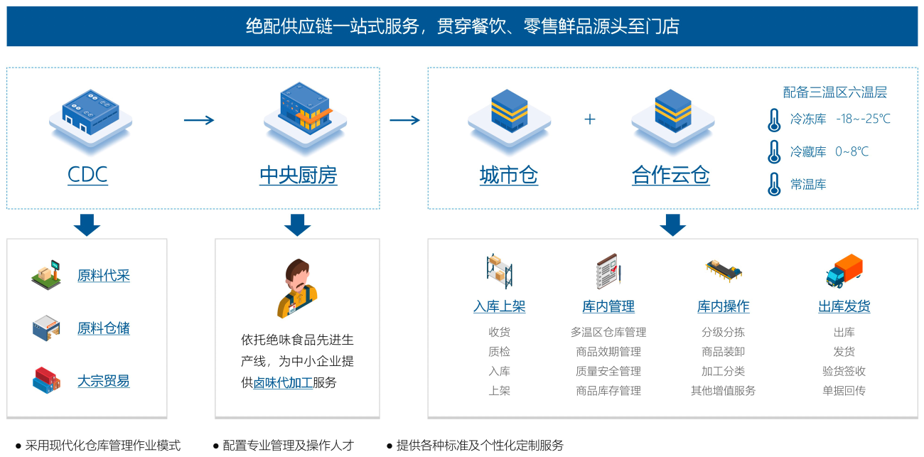 绝配供应链,同样是在服务绝味鸭脖万店模型的成功中,开始将核心能力赋能连锁餐饮。其业务中主要有冷链运输及仓储两大服务产品: