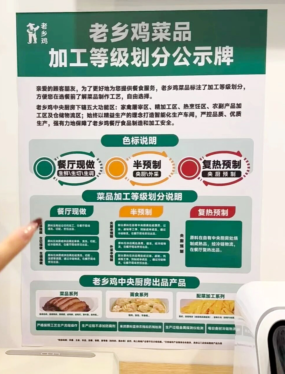 另一方面,知情权的满足。就在西贝深陷舆论漩涡时,老乡鸡却意外出圈。其中的区别除了价格维度之外,便是老乡鸡明确的标识了菜品加工等级,分为了“餐厅现做-半预制-复热预制”几个等级,保障了消费者对预制菜的知情权。