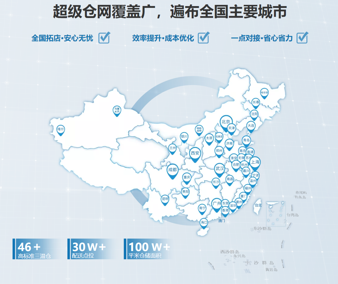 其中,城际干线网络覆盖全国四横四纵冷链主干网,拥有200+条跨省跨城城际往返线路,1000+条冷链线路,2000+辆车辆调度资源;仓储方面,其在全国范围内拥有CDC(3个)+工厂仓(21个)+DC(39个)+ FDC(72个)的多层次仓网布局覆盖。