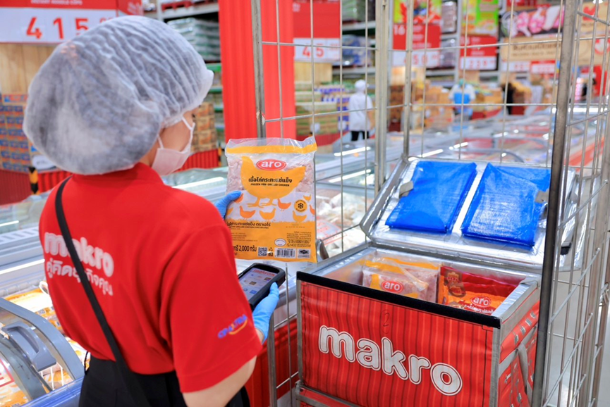图:在曼谷一家万客隆超市里,工作人员在数字系统指引下拣货,效率提升140%