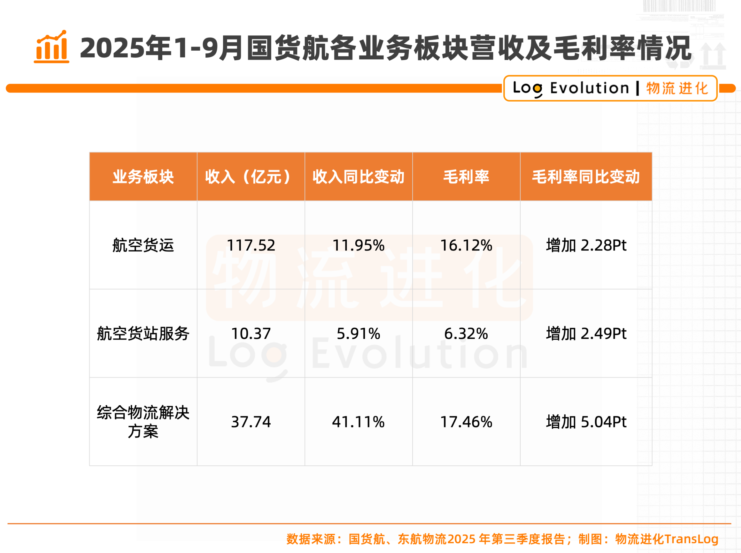 与此同时,前三季度国货航各个板块的毛利率也实现同比增长。其中,航空货运服务毛利率增长2.28个百分点至16.12%、航空货站服务毛利率增长2.49个百分点至6.32%、综合物流解决方案毛利率同比增长5.04个百分点至17.46%。