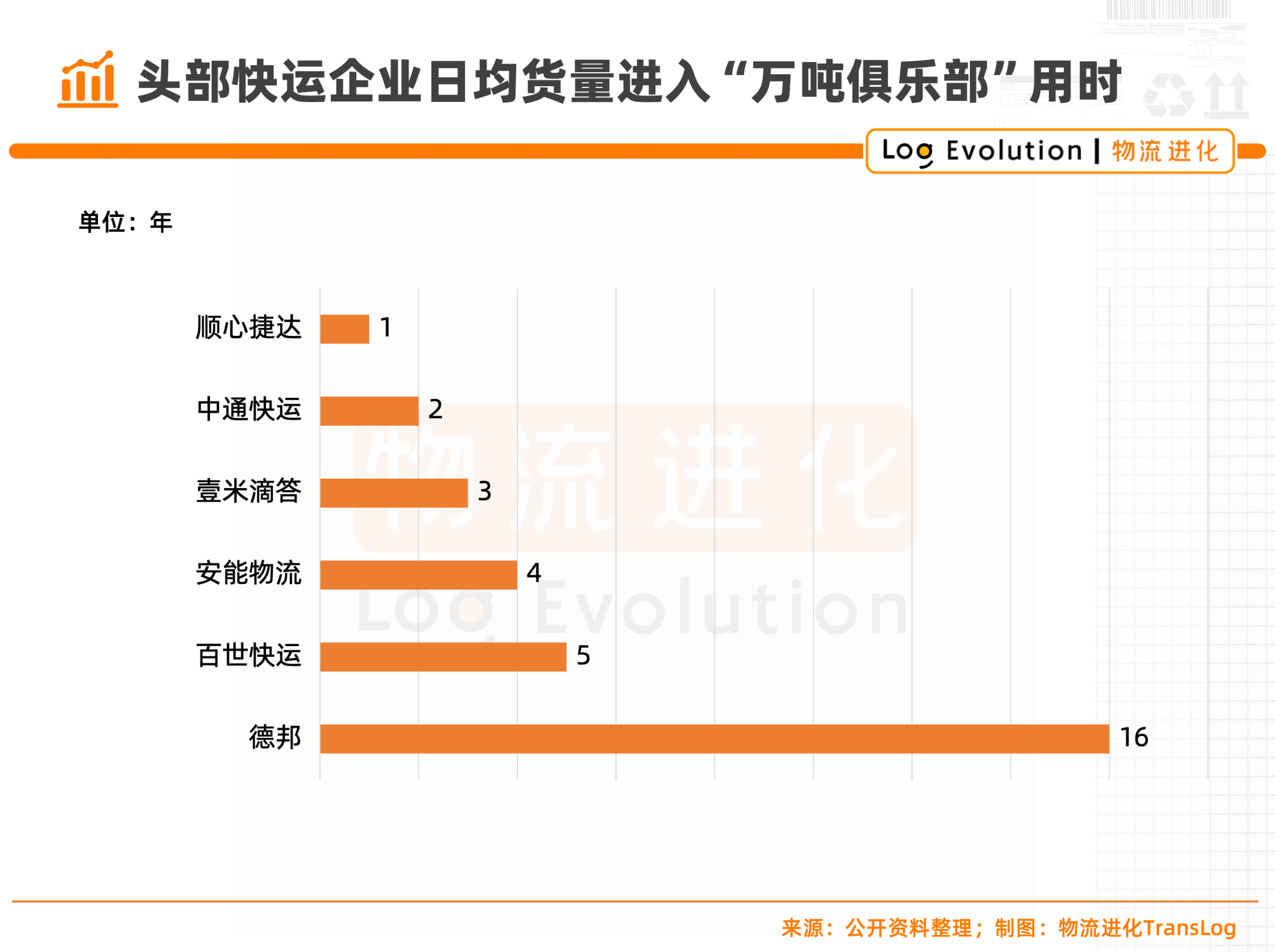 在直营制时代,快运网络代表型玩家进入10000吨/天的货量规模,普遍要花10年以上的时间;加盟制模式创新的时代,大家通过资本和模式的组合,把时间压缩到了4-5年时间;而从快递成功跨界而来的中通快运,直接把这个时间拉到了2年内。