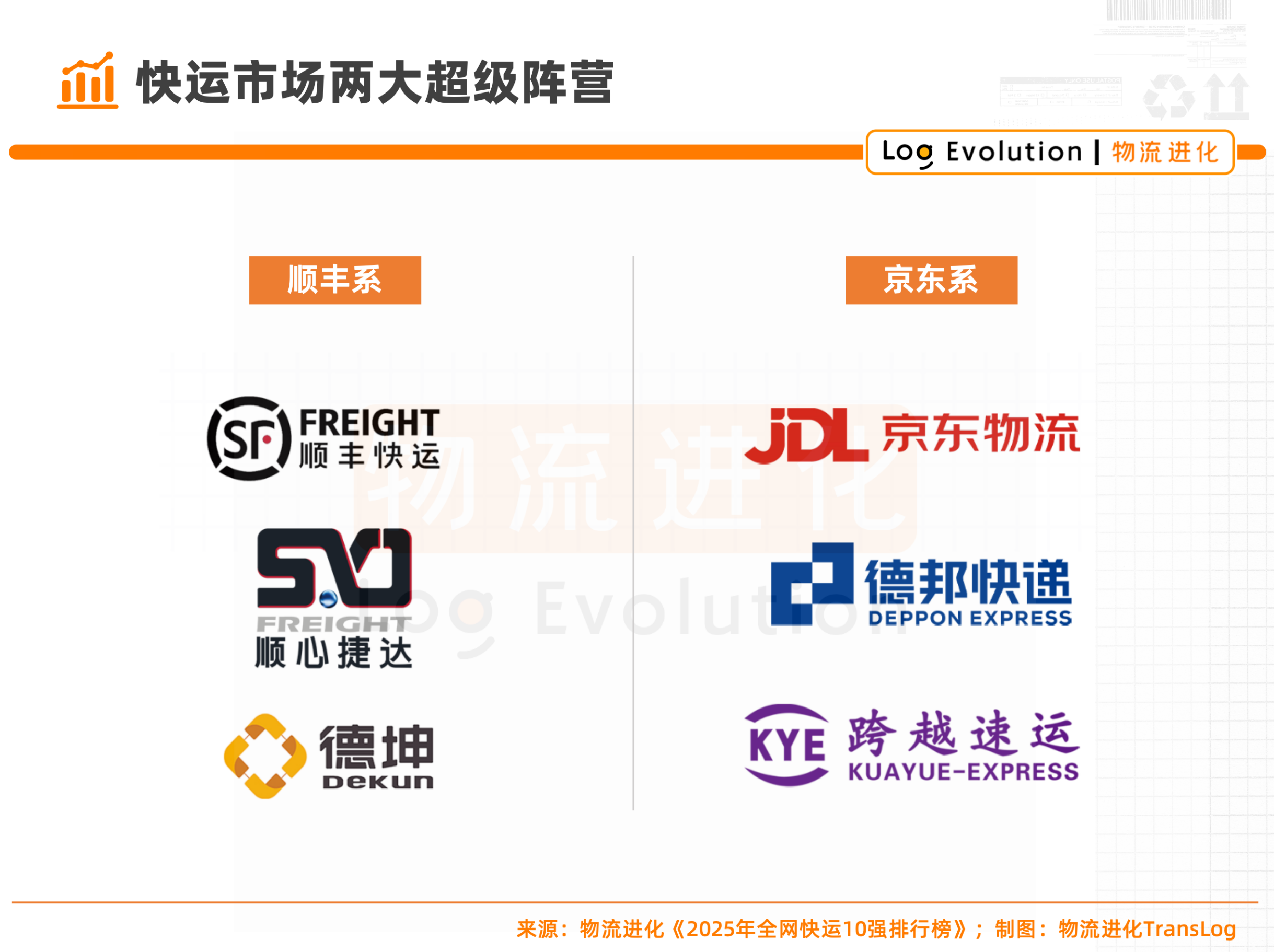 经过密集的收并购动作之后,尤其是顺丰快运、京东物流等巨头通过整合并购,在快运市场形成两大超级阵营,分别为京东快运、跨越速运、德邦快递组成的“京东系”,以及顺丰快运、顺心捷达、德坤物流组成的“顺丰系”。