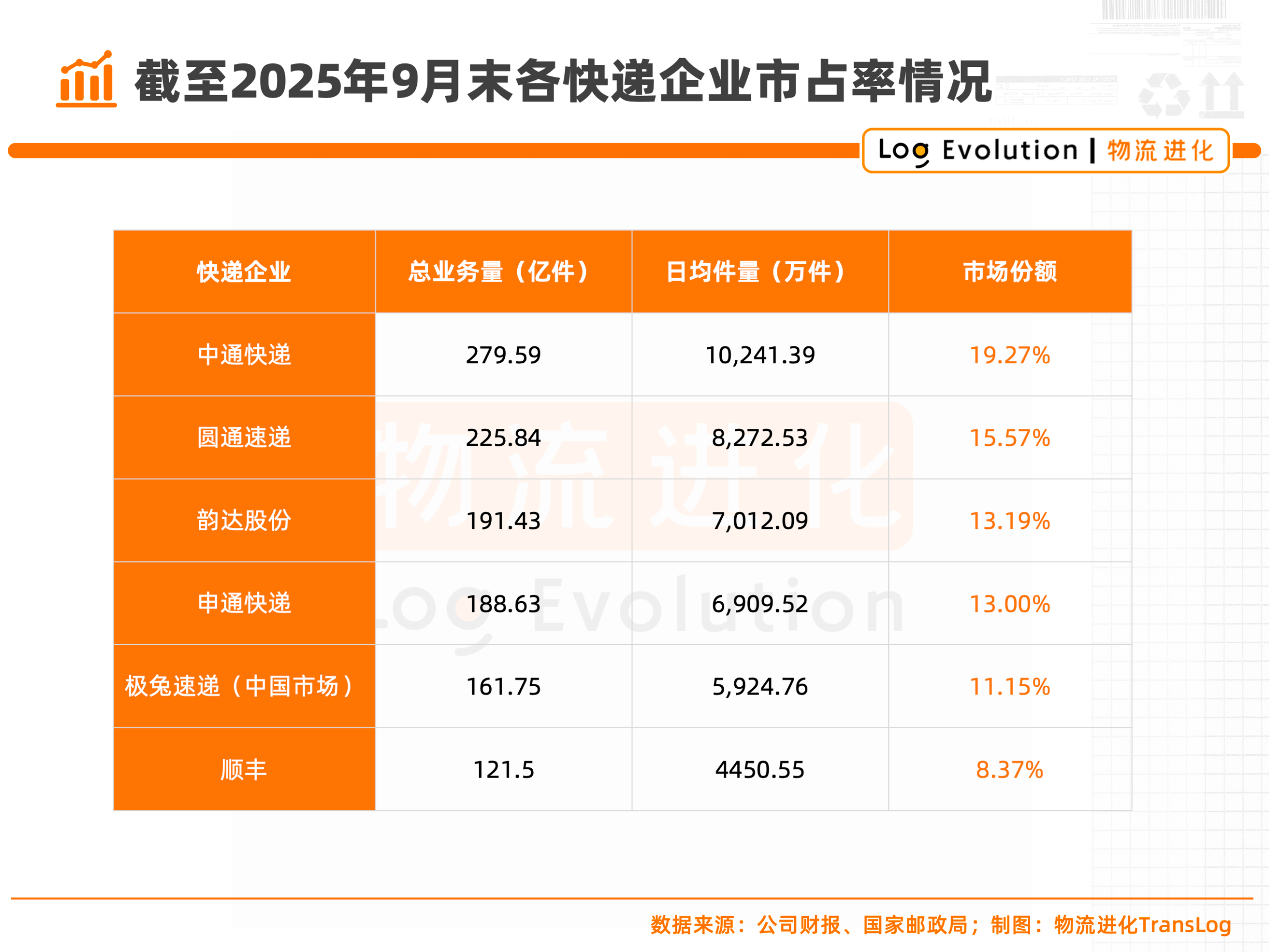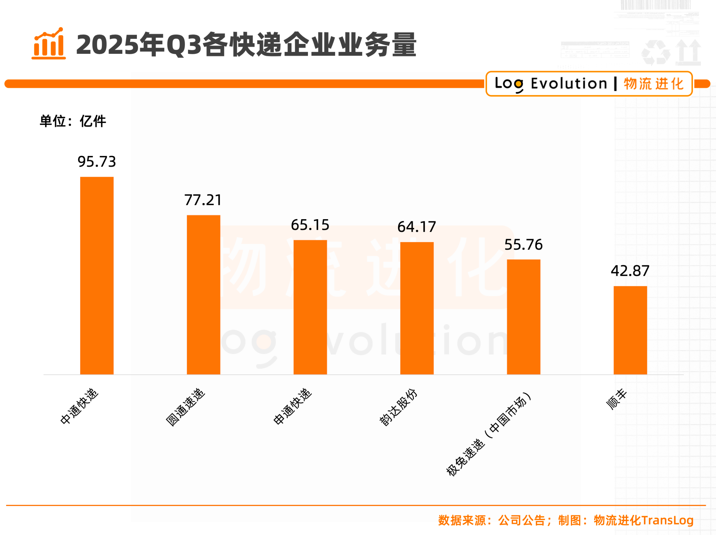 中通业务量达到95.73亿票,圆通业务量达到77.21亿票,申通业务量达到65.15亿票,韵达业务量达到64.17亿票,极兔(中国市场)业务量达到55.76亿票,顺丰业务量达到42.87亿票。