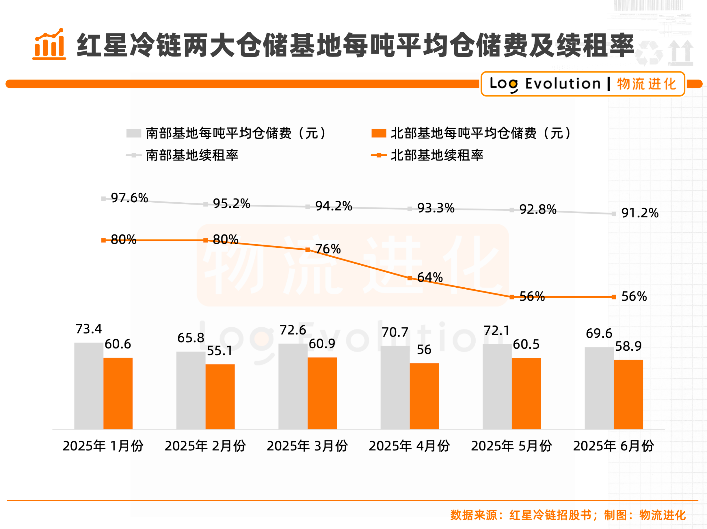 更严峻的是,自2025年以来,红星冷链仓储基地每吨平均仓储费、续租率已出现下降趋势。其中,南部基地的每吨平均仓储费从1月末的73.4元/吨,下降至6月末的69.6元/吨;续租率则从97.6%降至91.2%;北部基地的每吨平均仓储费从60.6降至58.9元/吨;续租率则从80.0%大幅降至56.0%。