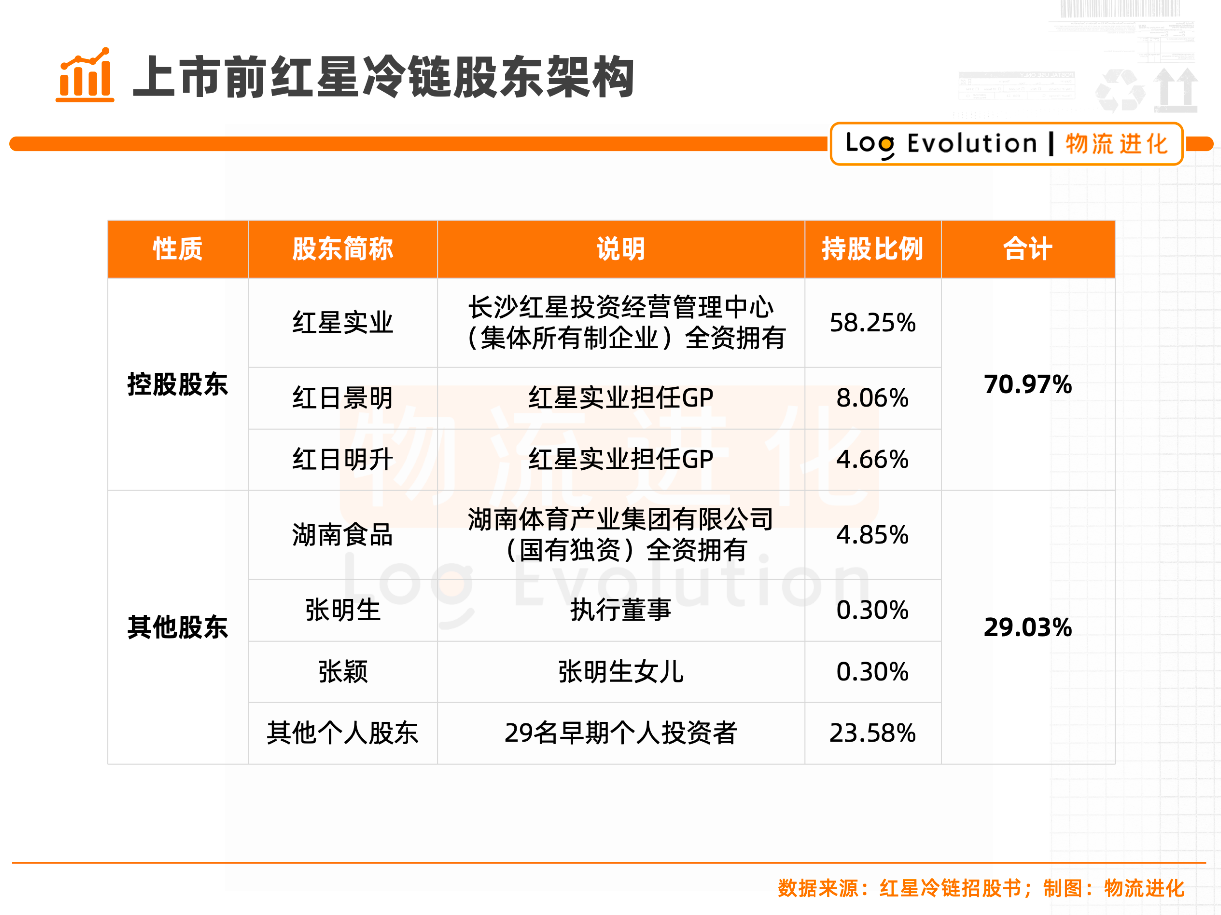 招股书显示,红星冷链IPO前的股东架构中,红星实业直接持股58.25%,并通过红日景明及红日明升分别持股8.06%及4.66%,合计持股70.97%;