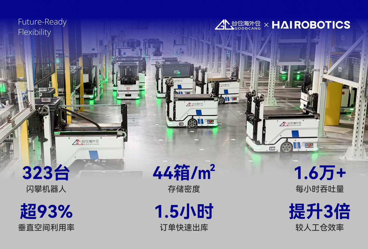 谷仓海外仓在其美西仓部署323台闪攀机器人,实现垂直空间利用率超93%,存储密度达44箱/㎡,系统支持每小时处理超16000件商品,效率较传统人工仓提升3倍,最快1.5小时完成订单发货,显著降低运营成本、提升客户引入能力。