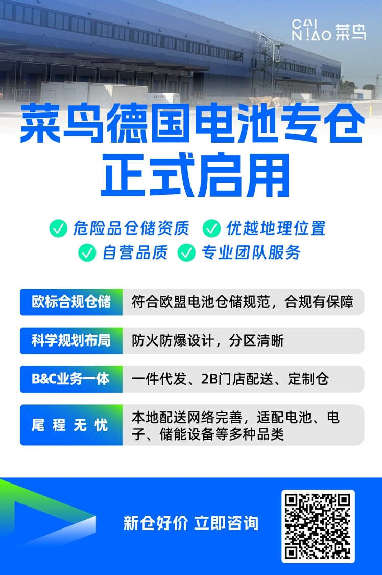 在德国曼海姆,菜鸟电池专仓已全面投入运营,多个头部带蓄电池的电器品牌已入仓,可以支持储能电池、大功率带电商品等中国外贸“新三样”加速出海。新仓库距离交通枢纽法兰克福仅约1小时车程,帮助商家快速连接德国国内市场,并向整个欧洲市场辐射。