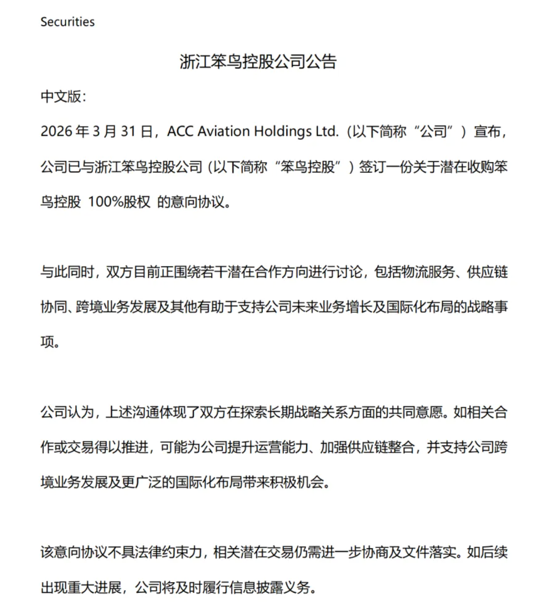 3月31日,ACC Aviation Holdings Ltd.(以下简称“ACC航空控股”)宣布,已与浙江笨鸟控股公司(以下简称“笨鸟控股”)签订一份关于潜在收购笨鸟控股100%股权的意向协议。